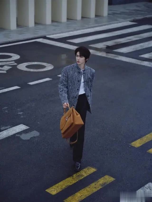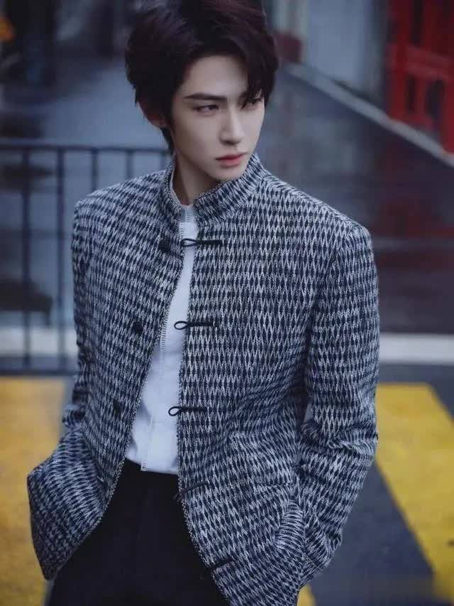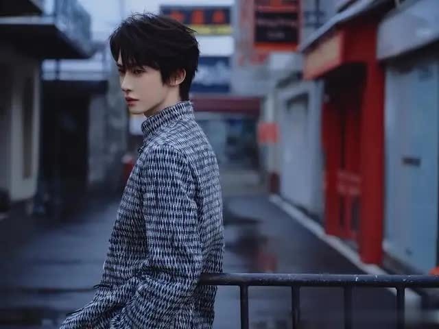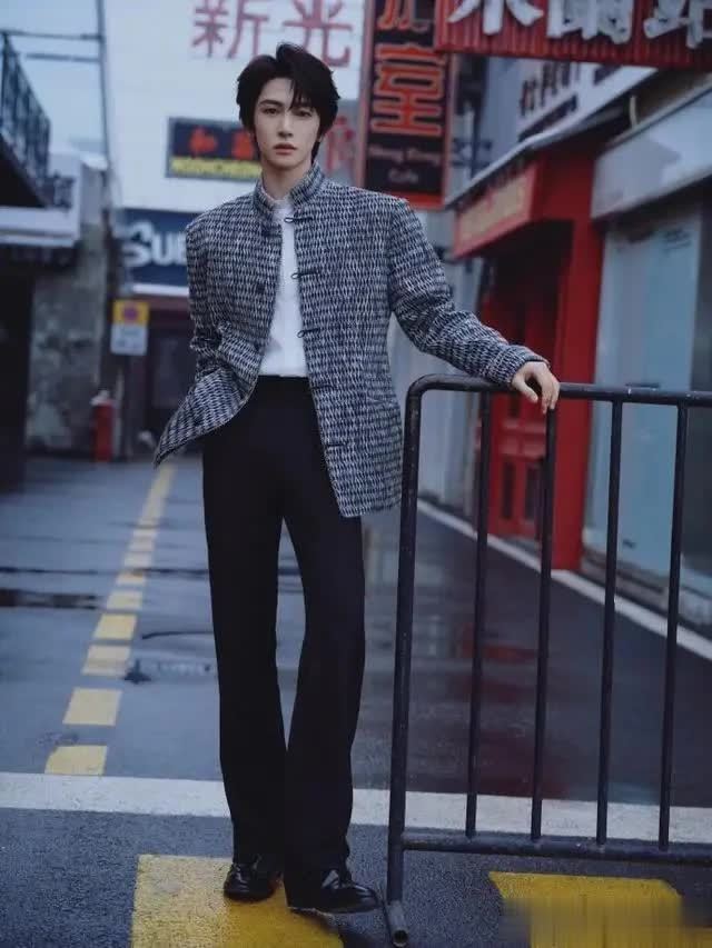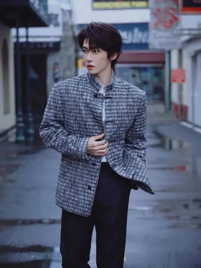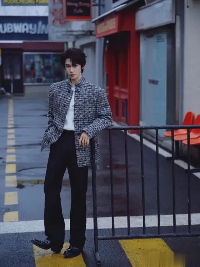 从国风舞台到日常穿搭,他始终深耕于东方文化的表达,一颦一笑、一站一坐,都带着骨子里的温润与雅致,这种浑然天成的东方气韵,绝非仅靠穿一件新中式衣服就能演绎出来的。镜头里的他,随意地走在雨后的街头,单手插兜靠在栏杆边,抬眼回眸时,眼神清俊温润,没有刻意的摆拍 pose,没有端着的营业感,只有少年人独有的舒展与笃定。他没有被衣服的框架束缚,反而用自身气质给这件新中式外套注入了鲜活的灵魂,让我们看到:新中式并非刻板、复古的,它可以是少年气的、现代的、走向世界的。
